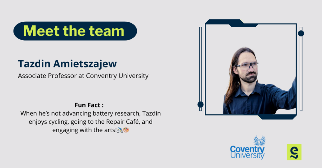 About Tazdin Amietszajew’s Role in the Project Tazdin Amietszajew’s is a research-focused Associate Professor at Coventry University, UK, bringing extensive expertise in electrochemical engineering and thermodynamic analysis of battery systems to the project. As a key contributor to different Work Packages (WP1, WP3, WP6, WP7), Tazdin plays a crucial role in advancing battery performance monitoring.